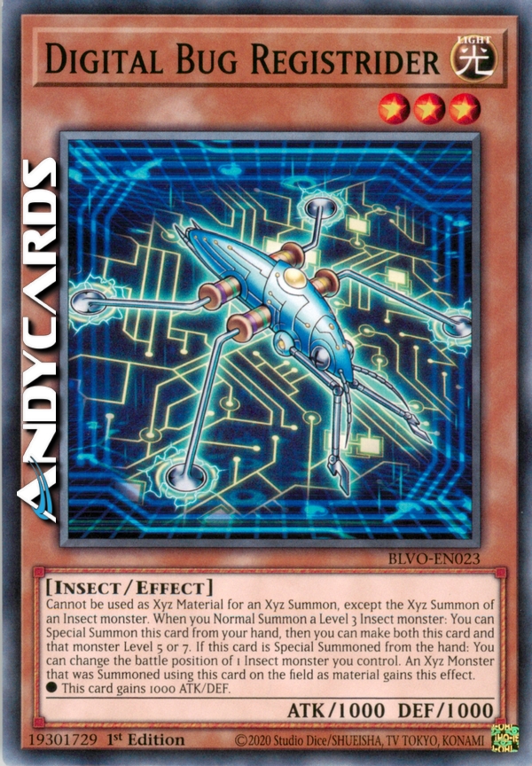 Cannot be used as Xyz Material for an Xyz Summon, except the Xyz Summon of an Insect monster. When you Normal Summon a Level 3 Insect monster: You can Special Summon this card from your hand, then you can make both this card and that monster Level 5 or 7. If this card is Special Summoned from the hand: You can change the battle position of 1 Insect monster you control. An Xyz Monster that was Summoned using this card on the field as material gains this effect.