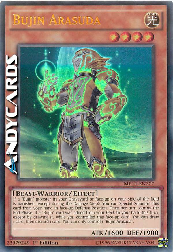 If a "Bujin" monster in your Graveyard or face-up on your side of the field is banished (except during the Damage Step): You can Special Summon this card from your hand in face-up Defense Position. Once per turn, during the End Phase, if a "Bujin" card was added from your Deck to your hand this turn, except by drawing it, while you controlled this face-up card: You can draw 1 card, then discard 1 card. You can only control 1 "Bujin Arasuda".
