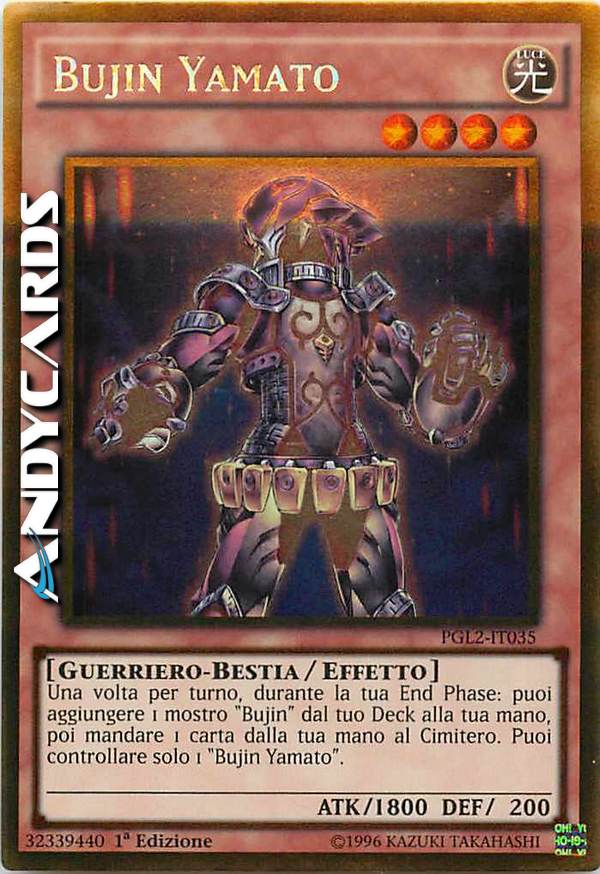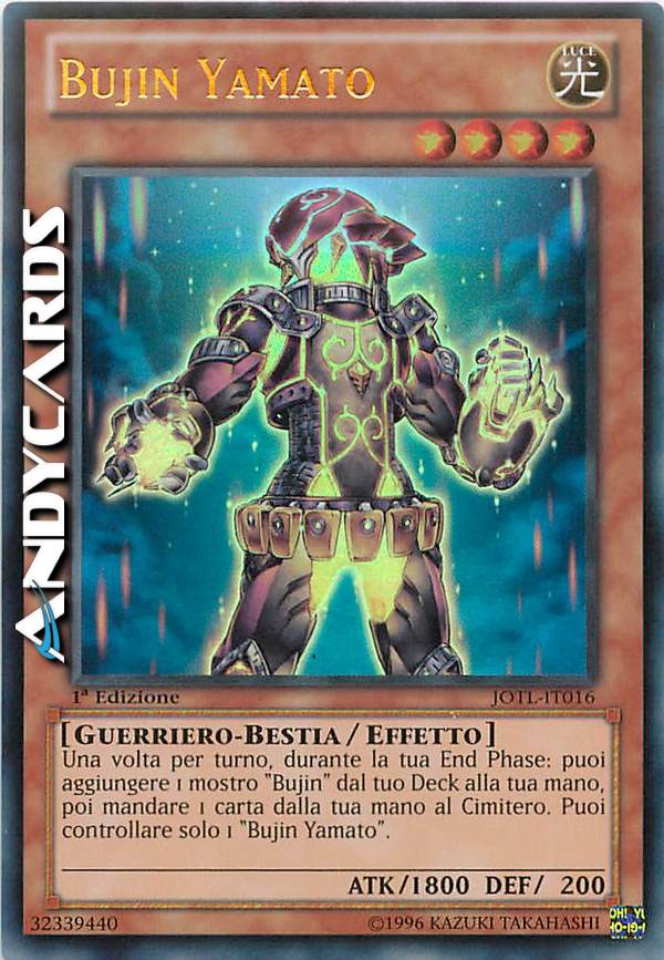 Una volta per turno, durante la tua End Phase: puoi aggiungere 1 mostro "Bujin" dal tuo Deck alla tua mano, poi mandare 1 carta dalla tua mano al Cimitero. Puoi controllare solo 1 "Bujin Yamato".