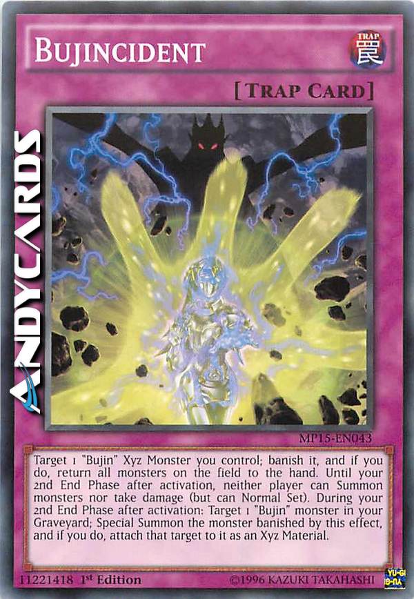 Target 1 "Bujin" Xyz Monster you control; banish it, and if you do, return all monsters on the field to the hand. Until your 2nd End Phase afteractivation, neither player can Summon monsters nor take damage(but can Normal Set). During your 2nd End Phase after activation: Target 1 "Bujin" monster in your Graveyard; Special Summon the monster banished by this effect, and if you do, attach that target to it as an Xyz Material.