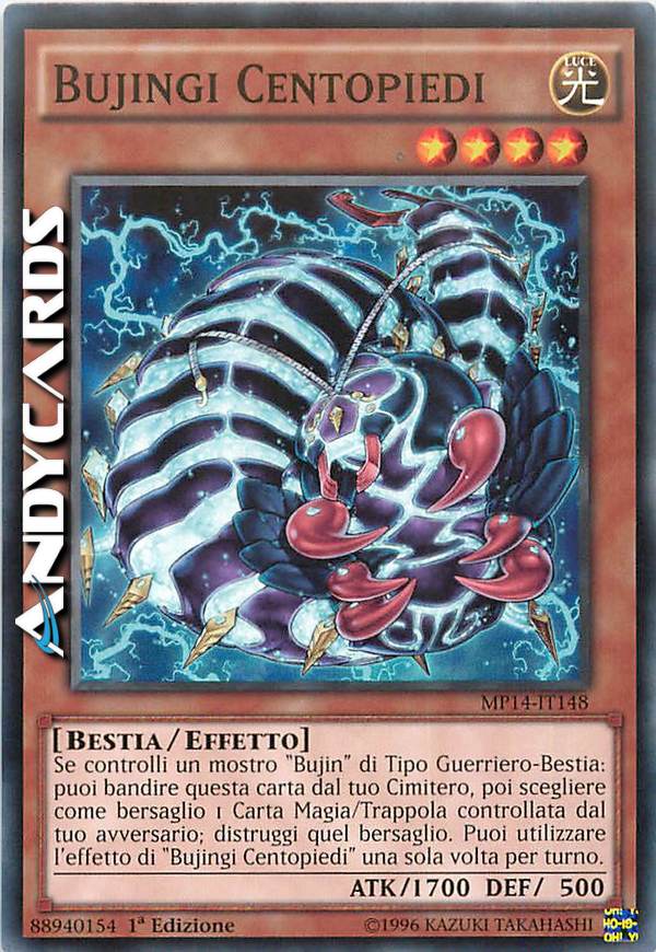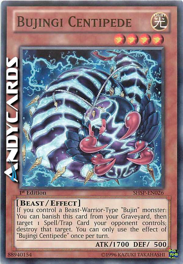 Se controlli un mostro "Bujin" di Tipo Guerriero-Bestia: puoi bandire questa carta dal tuo Cimitero, poi scegliere come bersaglio 1 Carta Magia/Trappola controllata dal tuo avversario; distruggi quel bersaglio. Puoi utilizzare l'effetto di "Bujingi Centopiedi" una sola volta per turno.