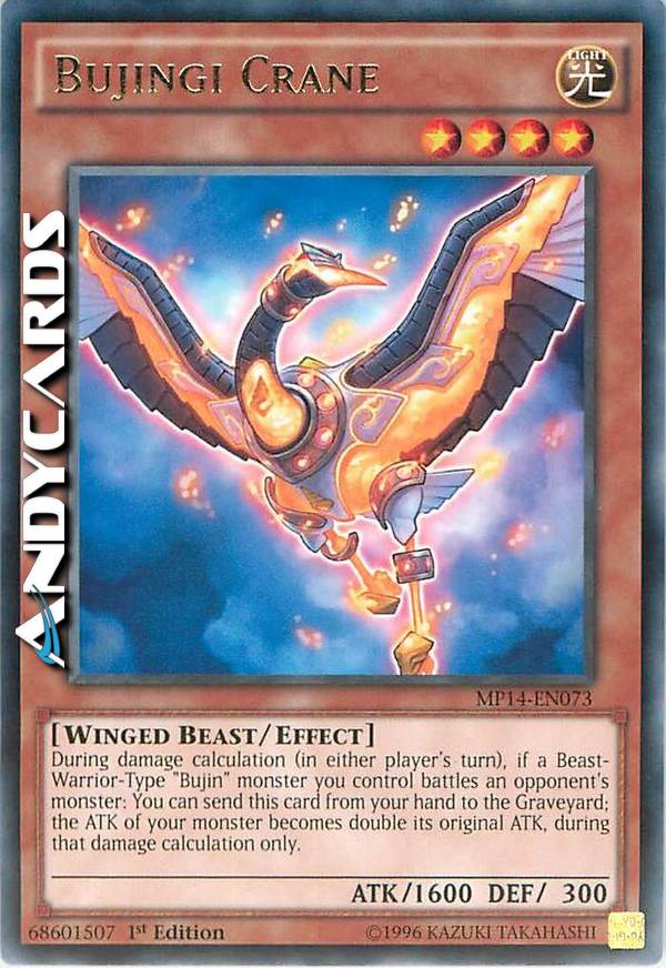 Durante il calcolo dei danni (nel turno di qualsiasi giocatore), se un mostro "Bujin" di Tipo Guerriero-Bestia che controlli combatte con un mostro dell'avversario: puoi mandare questa carta dalla tua mano al Cimitero; l'ATK del tuo mostro diventa il doppio del suo ATK originale, solamente durante il calcolo dei danni.