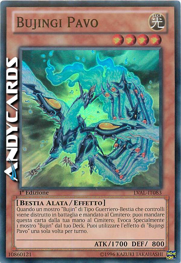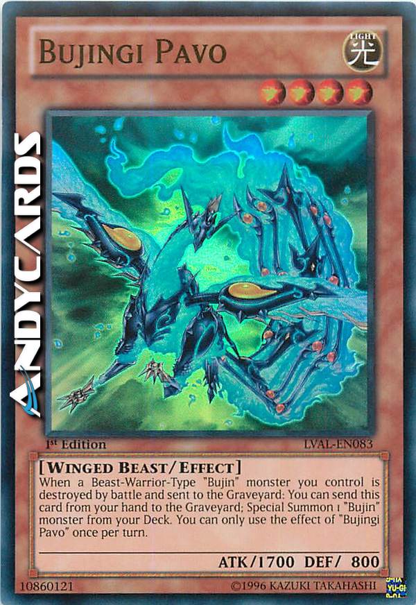 Quando un mostro "Bujin" di Tipo Guerriero-Bestia che controlli viene distrutto in battaglia e mandato al Cimitero: puoi mandare questa carta dalla tua mano al Cimitero; Evoca Specialmente 1 mostro "Bujin" dal tuo Deck. Puoi utilizzare l'effetto di "Bujingi Pavo" una sola volta per turno.
