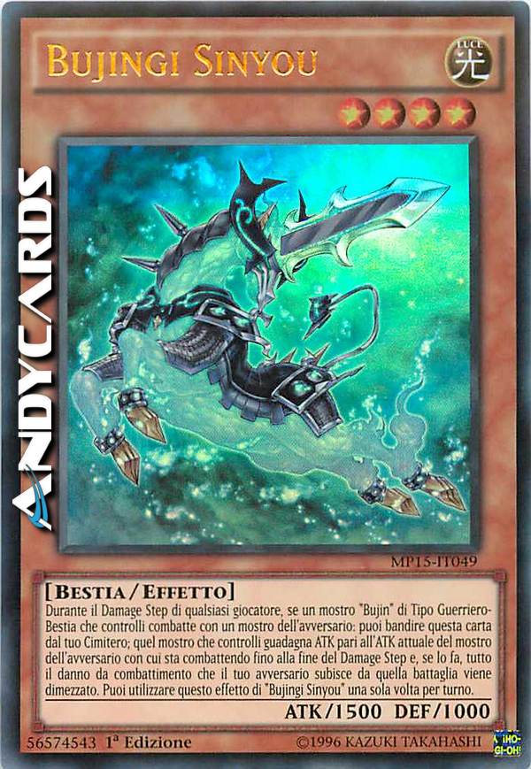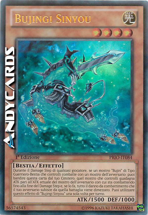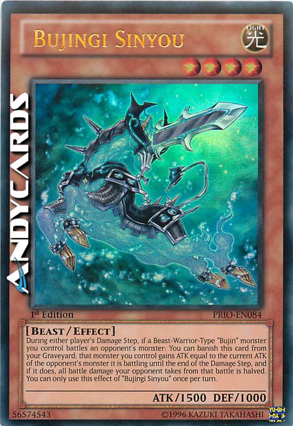 Durante il Damage Step di qualsiasi giocatore, se un mostro "Bujin" di Tipo Guerriero-Bestia che controlli combatte con un mostro dell'avversario: puoi bandire questa carta dal tuo Cimitero; quel mostro che controlli guadagna ATK pari all'ATK attuale del mostro dell'avversario con cui sta combattendo fino alla fine del Damage Step e, se lo fai, tutto il danno da combattimento che il tuo avversario subisce da quella battaglia viene dimezzato. puoi utilizzare questo effetto di "Bujingi Sinyou" una sola volta per turno.