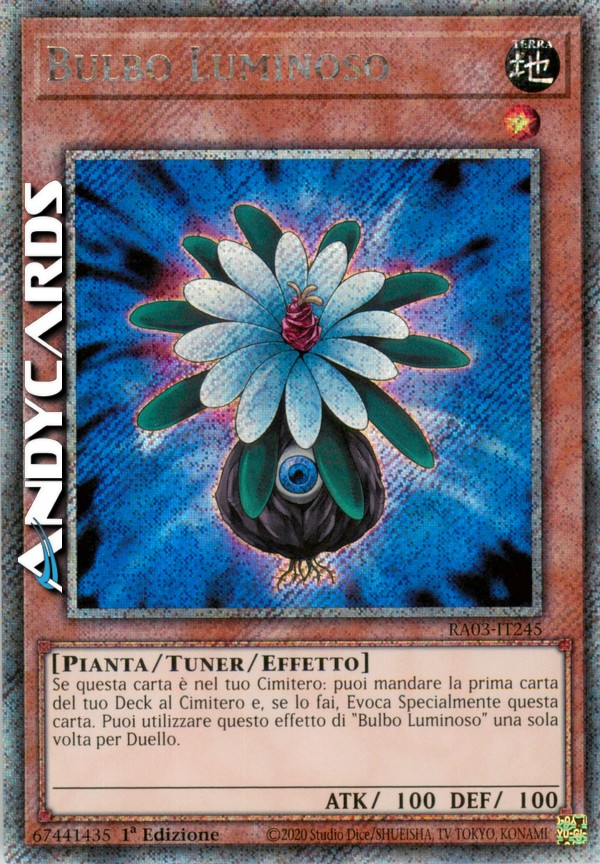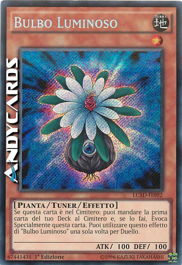 Puoi mandare la prima carta del tuo Deck al Cimitero ed Evocare Specialmente questa carta dal tuo Cimitero. Ogni giocatore può utilizzare l'effetto di "Bulbo Luminoso" una sola volta per Duello.