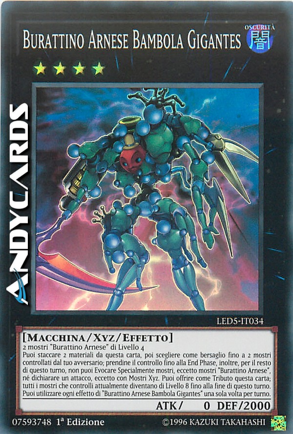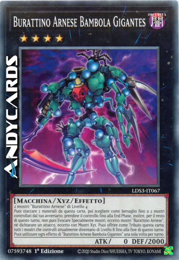 Puoi staccare 2 materiali da questa carta, poi scegliere come bersaglio fino a 2 mostri controllati dal tuo avversario; prendine il controllo fino alla End Phase, inoltre, per il resto di questo turno, non puoi Evocare Specialmente mostri, eccetto mostri "Burattino Arnese", né dichiarare un attacco, eccetto con Mostri Xyz. Puoi offrire come Tributo questa carta; tutti i mostri che controlli attualmente diventano di Livello 8 fino alla fine di questo turno. Puoi utilizzare ogni effetto di "Burattino Arnese Bambola Gigantes" una sola volta per turno.