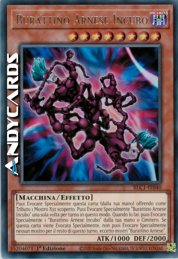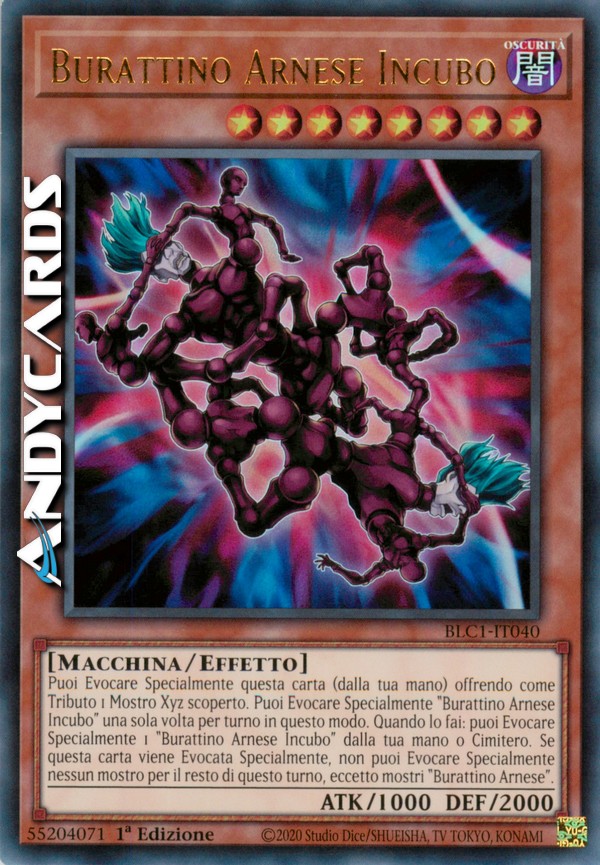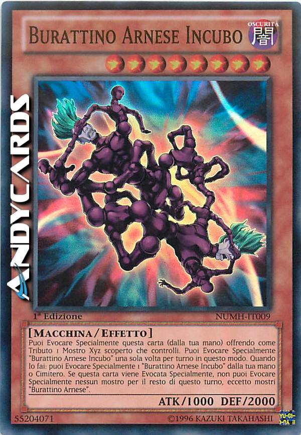 Puoi Evocare Specialmente questa carta (dalla tua mano) offrendo come Tributo 1 Mostro Xyz scoperto che controlli. Puoi Evocare Specialmente "Burattino Arnese Incubo" una sola volta per turno in questo modo. Quando lo fai: puoi Evocare Specialmente 1 "Burattino Arnese Incubo" dalla tua mano o Cimitero. Se questa carta viene Evocata Specialmente, non puoi Evocare Specialmente nessun mostro per il resto di questo turno, eccetto mostri "Burattino Arnese".