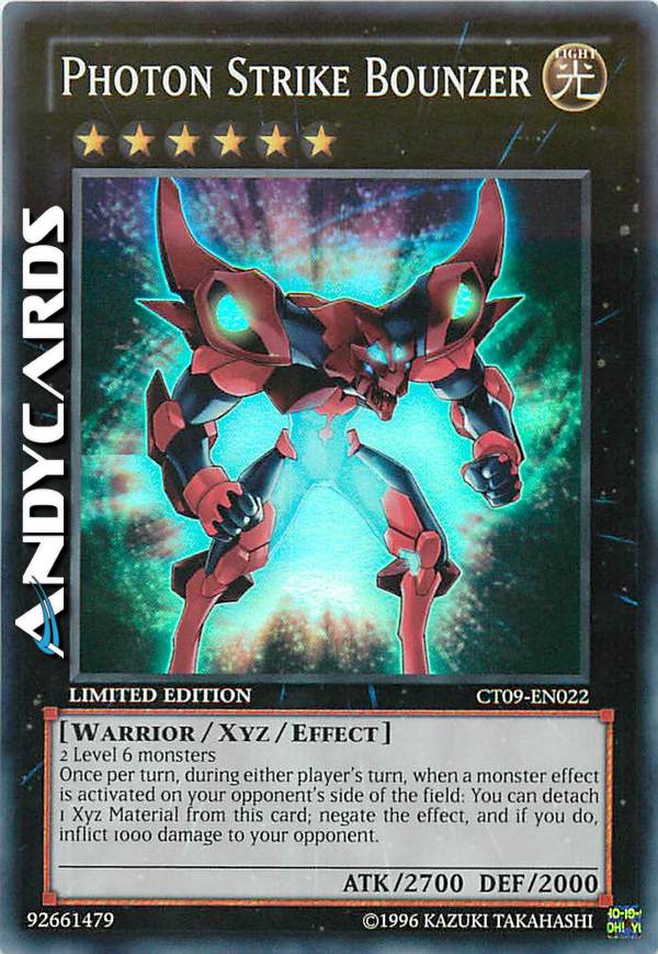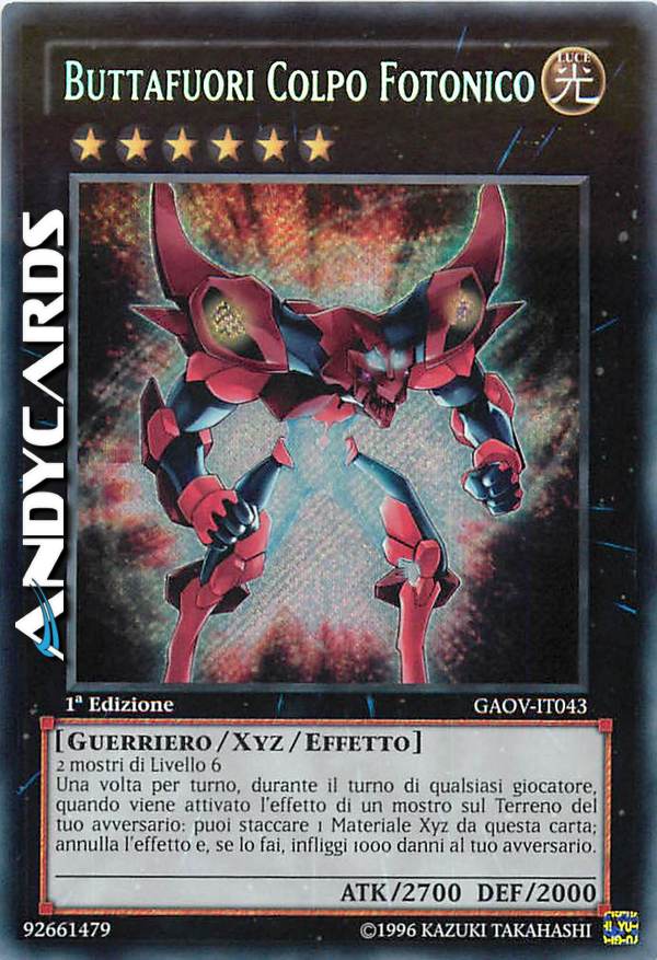 2 mostri di Livello 6 Una volta per turno, durante il turno di qualsiasi giocatore, quando viene attivato l'effetto di un mostro sul Terreno del tuo avversario: puoi staccare 1 Materiale Xyz da questa carta; annulla l'effetto e, se lo fai, infliggi 1000 danni al tuo avversario.