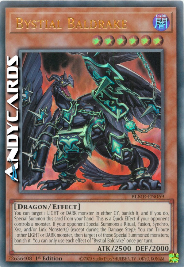 You can target 1 LIGHT or DARK monster in either GY; banish it, and if you do, Special Summon this card from your hand. This is a Quick Effect if your opponent controls a monster. If your opponent Special Summons a Ritual, Fusion, Synchro, Xyz, and/or Link Monster(s) (except during the Damage Step): You can Tribute 1 other LIGHT or DARK monster, then target 1 of those Special Summoned monsters; banish it. You can only use each effect of "Bystial Baldrake" once per turn.