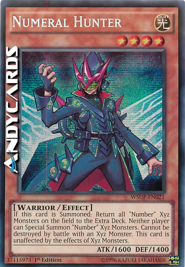 If this card is Summoned: Return all "Number" Xyz Monsters on the field to the Extra Deck. Neither player can Special Summon "Number" Xyz Monsters. Cannot be destroyed by battle with an Xyz Monster. This card is unaffected by the effects of Xyz Monsters.