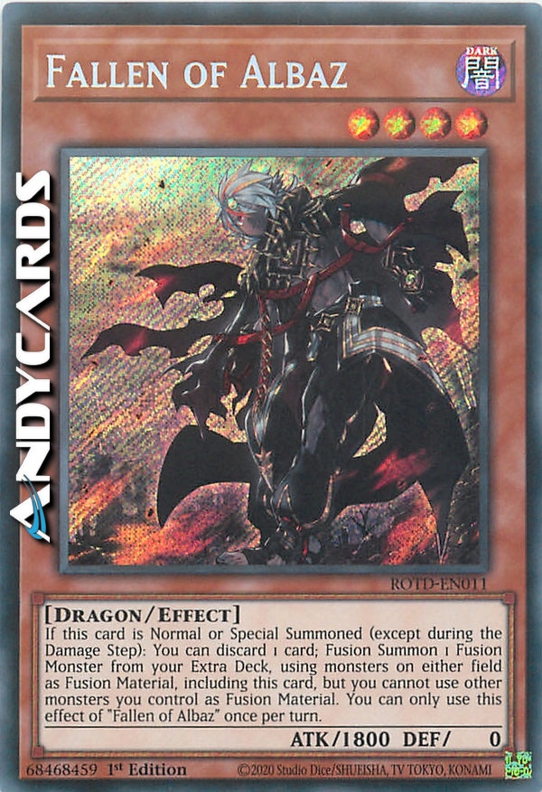 If this card is Normal or Special Summoned (except during the Damage Step): You can discard 1 card; Fusion Summon 1 Fusion Monster from your Extra Deck, using monsters on either field as Fusion Material, including this card, but you cannot use other monsters you control as Fusion Material. You can only use this effect of "Fallen of Albaz" once per turn.