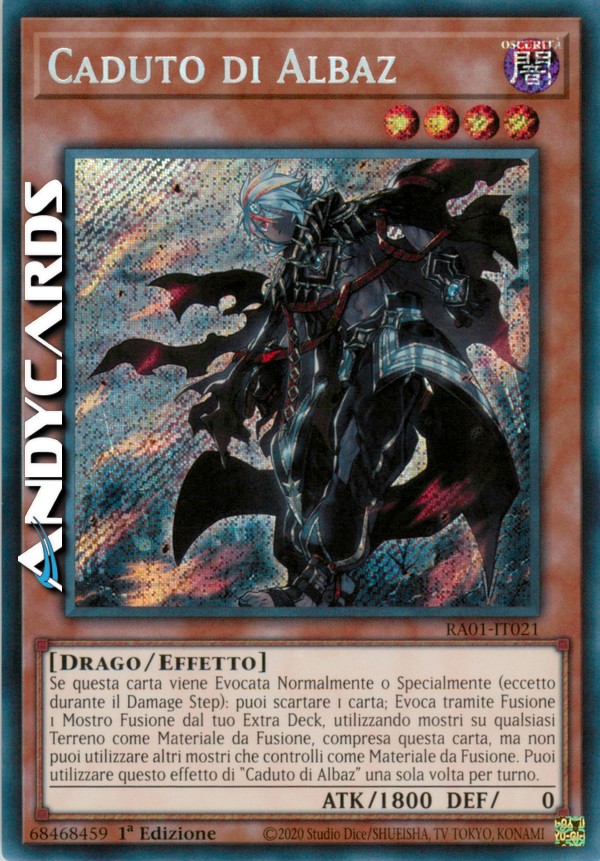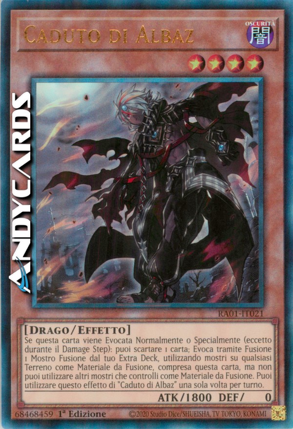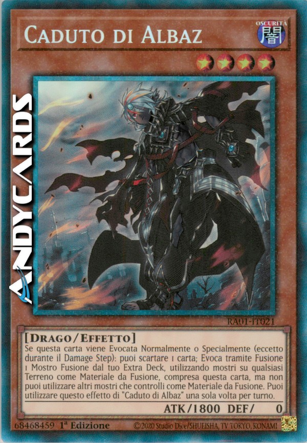 Se questa carta viene Evocata Normalmente o Specialmente (eccetto durante il Damage Step): puoi scartare 1 carta; Evoca tramite Fusione 1 Mostro Fusione dal tuo Extra Deck, utilizzando mostri su qualsiasi Terreno come Materiale da Fusione, compresa questa carta, ma non puoi utilizzare altri mostri che controlli come Materiale da Fusione. Puoi utilizzare questo effetto di "Caduto di Albaz" una sola volta per turno.