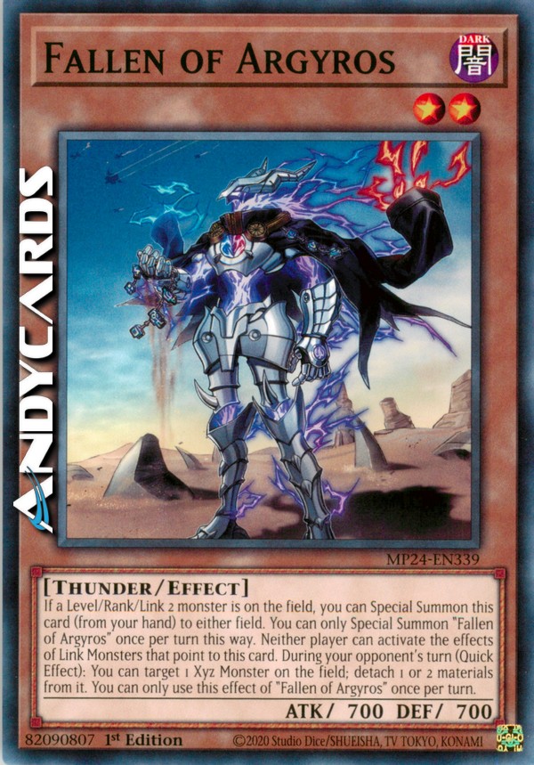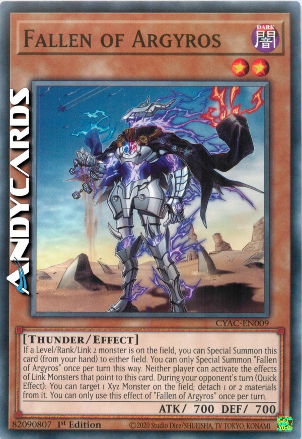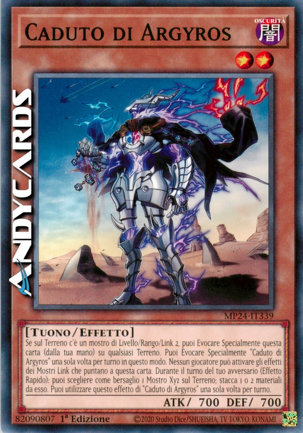 Se sul Terreno c'è un mostro di Livello/Rango/Link 2, puoi Evocare Specialmente questa carta (dalla tua mano) su qualsiasi Terreno. Puoi Evocare Specialmente "Caduto di Argyros" una sola volta per turno in questo modo. Nessun giocatore può attivare gli effetti dei Mostri Link che puntano a questa carta. Durante il turno del tuo avversario (Effetto Rapido): puoi scegliere come bersaglio 1 Mostro Xyz sul Terreno; stacca 1 o 2 materiali da esso. Puoi utilizzare questo effetto di "Caduto di Argyros" una sola volta per turno.