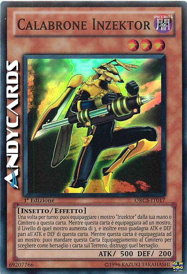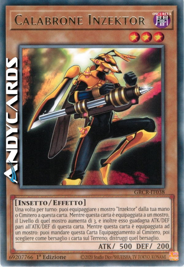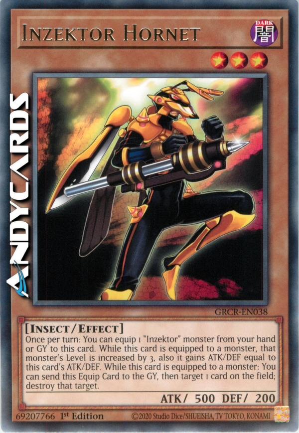 Una volta per turno: puoi equipaggiare 1 mostro "Inzektor" dalla tua mano o Cimitero a questa carta. Mentre questa carta è equipaggiata ad un mostro, il Livello di quel mostro aumenta di 3, e inoltre esso guadagna ATK e DEF pari all'ATK e DEF di questa carta. Mentre questa carta è equipaggiata ad un mostro: puoi mandare questa Carta Equipaggiamento al Cimitero per scegliere come bersaglio 1 carta sul Terreno; distruggi quel bersaglio.