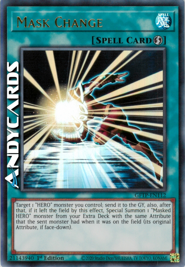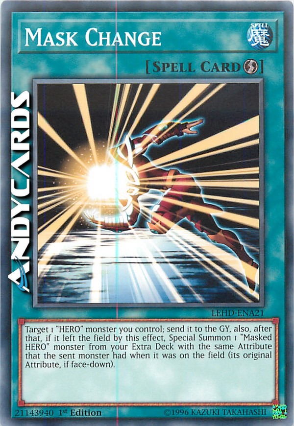 Scegli come bersaglio 1 mostro "EROE" che controlli; mandalo al Cimitero, inoltre, dopo aver fatto quello, se ha lasciato il Terreno a causa di questo effetto, Evoca Specialmente dal tuo Extra Deck 1 mostro "EROE Mascherato" con lo stesso Attributo che quel mostro aveva quando era sul Terreno (il suo Attributo originale, se coperto).