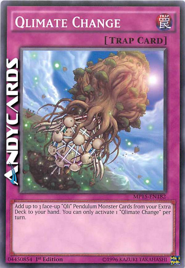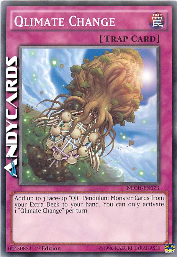 Add up to 3 face-up "Qli" Pendulum Monster Cards from your Extra Deck to your hand. You can only activate 1 "Qlimate Change" per turn.