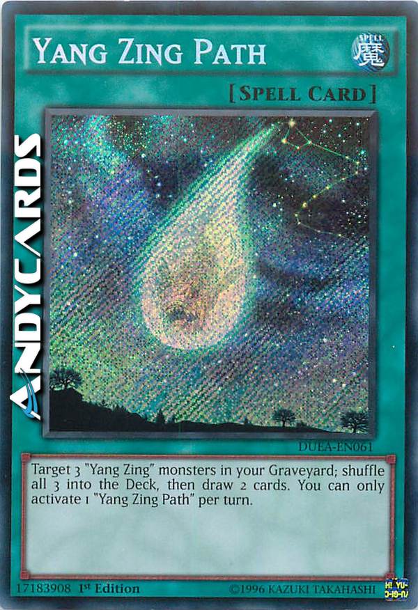 Target 3 "Yang Zing" monsters in your Graveyard; shuffle all 3 into the Deck, then draw 2 cards. You can only activate 1 "Yang Zing Path" per turn.