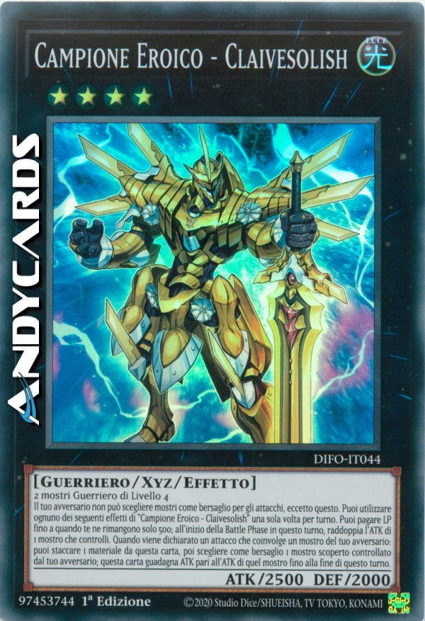 Il tuo avversario non può scegliere mostri come bersaglio per gli attacchi, eccetto questo. Puoi utilizzare ognuno dei seguenti effetti di "Campione Eroico - Claivesolish" una sola volta per turno. Puoi pagare LP fino a quando te ne rimangono solo 500; all'inizio della Battle Phase in questo turno, raddoppia l'ATK di 1 mostro che controlli. Quando viene dichiarato un attacco che coinvolge un mostro del tuo avversario: puoi staccare 1 materiale da questa carta, poi scegliere come bersaglio 1 mostro scoperto controllato dal tuo avversario; questa carta guadagna ATK pari all'ATK di quel mostro fino alla fine di questo turno.