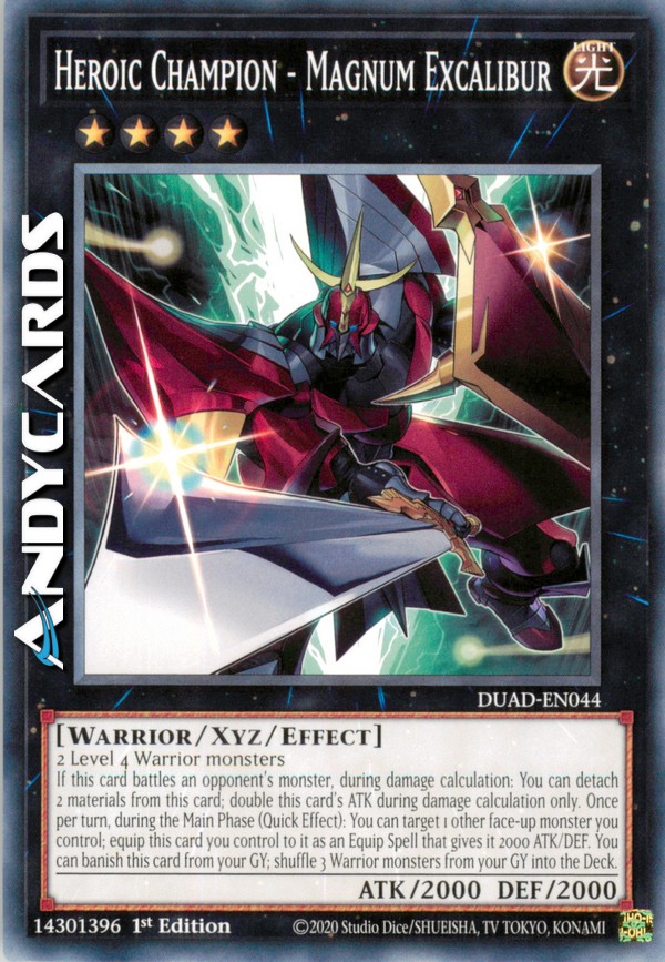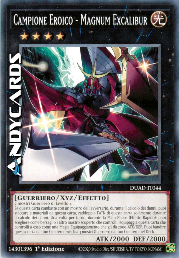 Se questa carta combatte con un mostro dell'avversario, durante il calcolo dei danni: puoi staccare 2 materiali da questa carta; raddoppia l'ATK di questa carta solamente durante il calcolo dei danni. Una volta per turno, durante la Main Phase (Effetto Rapido): puoi scegliere come bersaglio 1 altro mostro scoperto che controlli; equipaggia questa carta che controlli a esso come una Magia Equipaggiamento che gli dà 2000 ATK/DEF. Puoi bandire questa carta dal tuo Cimitero; mischia 3 mostri Guerriero dal tuo Cimitero nel Deck.