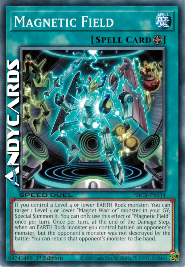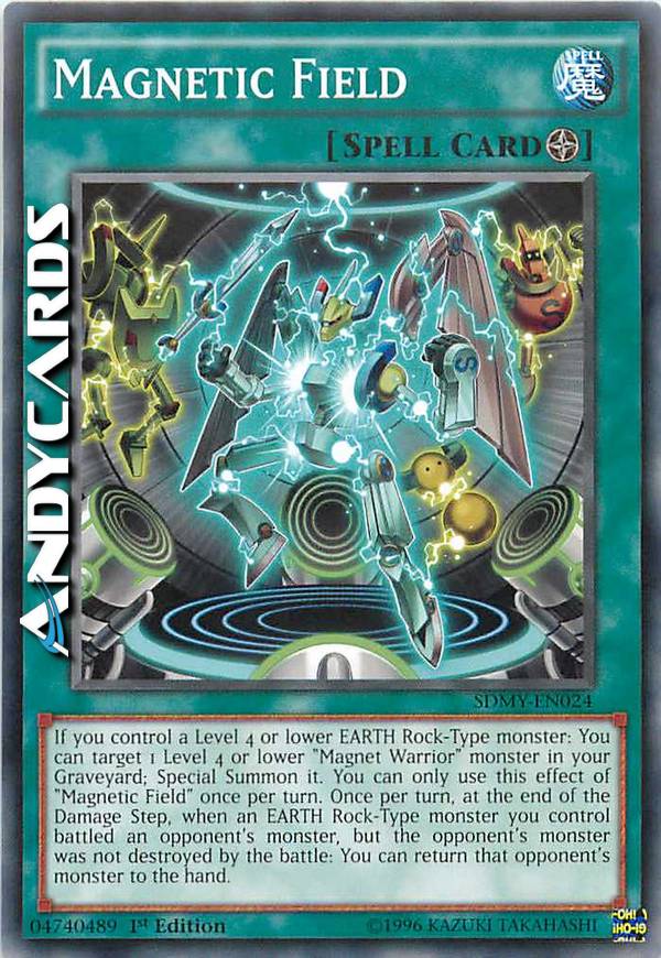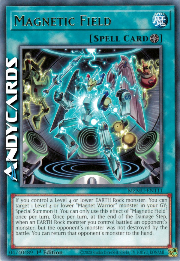 If you control a Level 4 or lower EARTH Rock monster: You can target 1 Level 4 or lower "Magnet Warrior" monster in your GY; Special Summon it. You can only use this effect of "Magnetic Field" once per turn. Once per turn, at the end of the Damage Step, when an EARTH Rock monster you control battled an opponent's monster, but the opponent's monster was not destroyed by the battle: You can return that opponent's monster to the hand.