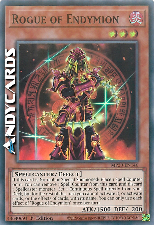If this card is Normal or Special Summoned: Place 1 Spell Counter on it. You can remove 1 Spell Counter from this card and discard 1 Spellcaster monster; Set 1 Continuous Spell directly from your Deck, but for the rest of this turn you cannot activate it, or activate cards, or the effects of cards, with its name. You can only use each effect of "Rogue of Endymion" once per turn.