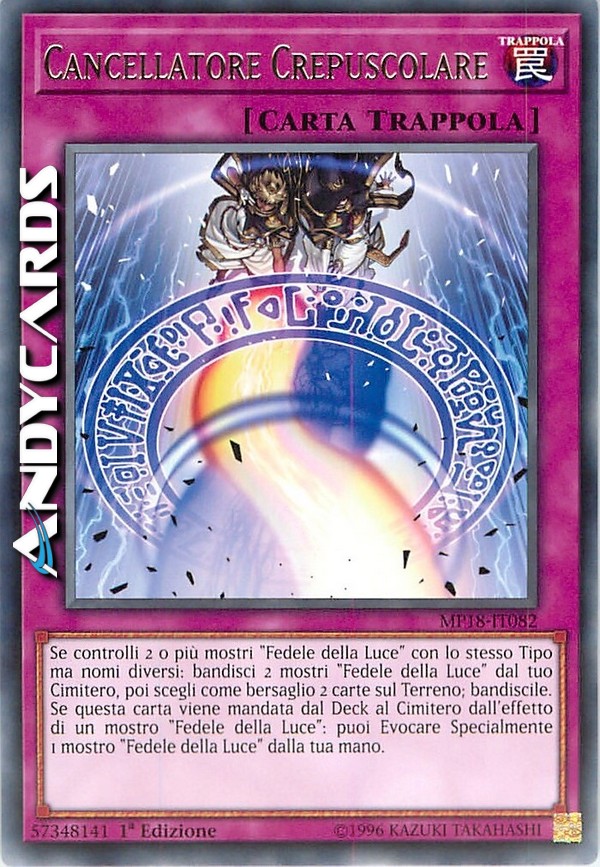 Se controlli 2 o più mostri "Fedele della Luce" con lo stesso Tipo ma nomi diversi: bandisci 2 mostri "Fedele della Luce" dal tuo Cimitero, poi scegli come bersaglio 2 carte sul Terreno; bandiscile. Se questa carta viene mandata dal Deck al Cimitero dall'effetto di un mostro "Fedele della Luce": puoi Evocare Specialmente 1 mostro "Fedele della Luce" dalla tua mano.