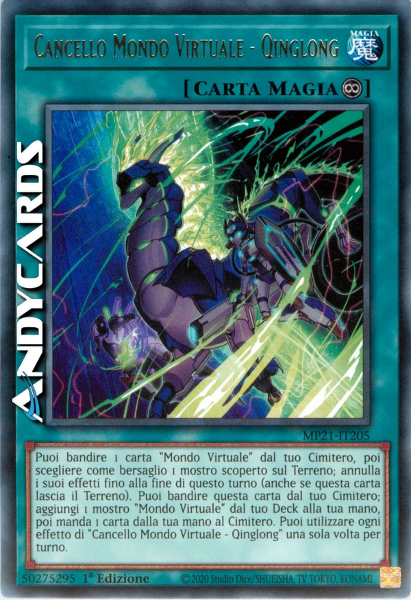 Puoi bandire 1 carta "Mondo Virtuale" dal tuo Cimitero, poi scegliere come bersaglio 1 mostro scoperto sul Terreno; annulla i suoi effetti fino alla fine di questo turno (anche se questa carta lascia il Terreno). Puoi bandire questa carta dal tuo Cimitero; aggiungi 1 mostro "Mondo Virtuale" dal tuo Deck alla tua mano, poi manda 1 carta dalla tua mano al Cimitero. Puoi utilizzare ogni effetto di "Cancello Mondo Virtuale - Qinglong" una sola volta per turno.