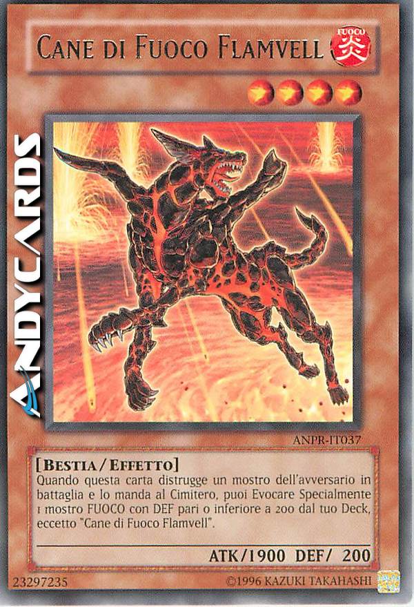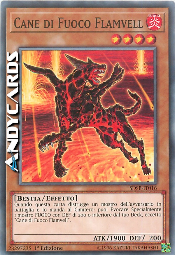 Quando questa carta distrugge un mostro dell'avversario in battaglia e lo manda al Cimitero: puoi Evocare Specialmente 1 mostro FUOCO con DEF di 200 o inferiore dal tuo Deck, eccetto "Cane di Fuoco Flamvell".