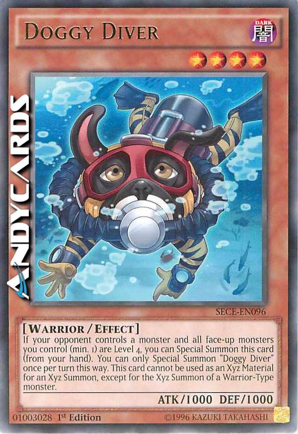 If your opponent controls a monster and all face-up monsters you control (min. 1) are Level 4, you can Special Summon this card (from your hand). You can only Special Summon "Doggy Diver" once per turn this way. This card cannot be used as an Xyz Material for an Xyz Summon, except for the Xyz Summon of a Warrior-Type monster