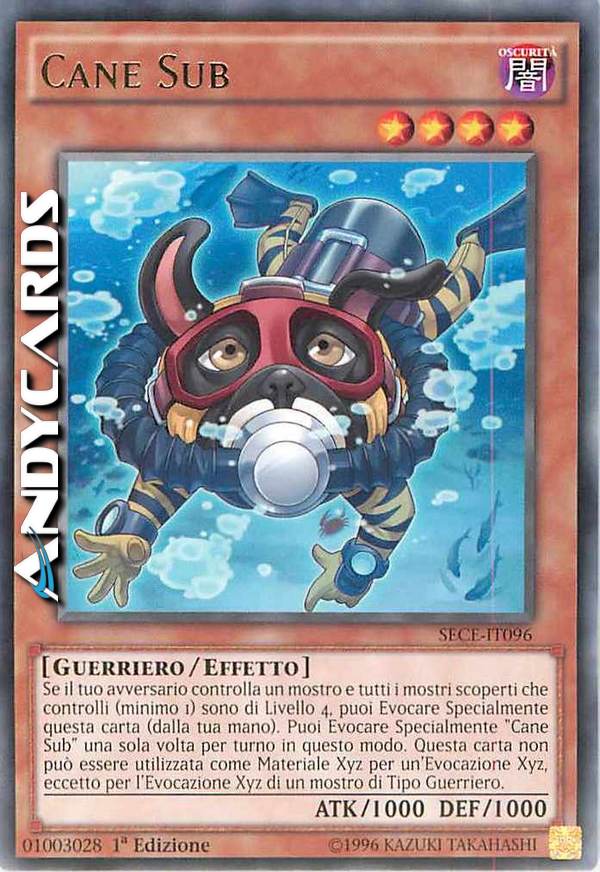 Se il tuo avversario controlla un mostro e tutti i mostri scoperti che controlli (minimo 1) sono di Livello 4, puoi Evocare Specialmente questa carta (dalla tua mano). Puoi Evocare Specialmente "Cane Sub" una sola volta per turno in questo modo. Questa carta non può essere utilizzata come Materiale Xyz per un'Evocazione Xyz, eccetto per l'Evocazione Xyz di un mostro di Tipo Guerriero.