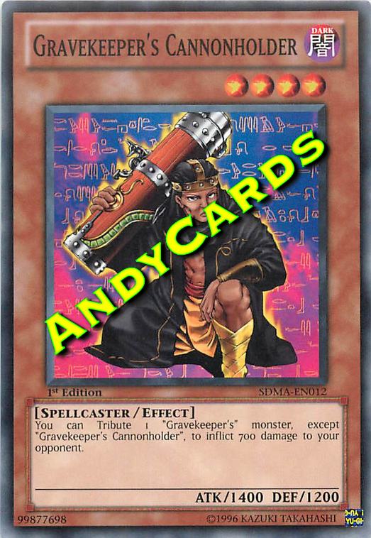 Offer 1 card that includes "Gravekeeper’s" in its card name on your side of the field as a tribute to inflict 700 points of Direct Damage to your opponent’s Life Points. However, you cannot offer this card or another "Gravekeeper’s Cannonholder" with this card’s effect. Monsters used for a Tribute Summon or that are offered as Tributes due to other cards’ effects are excluded.