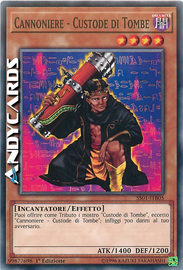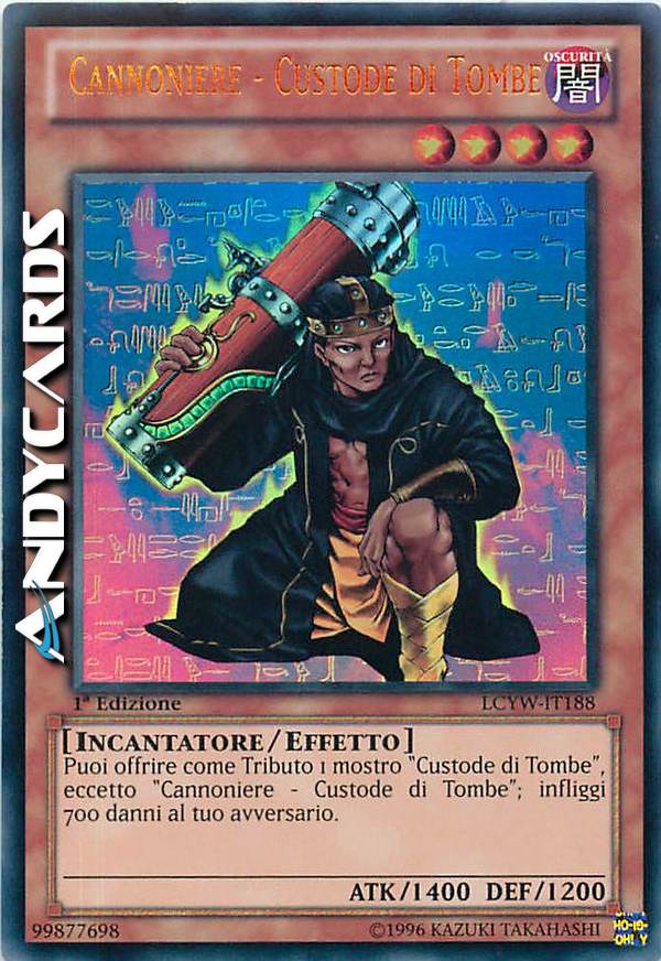 Puoi offrire come Tributo 1 mostro "Custode di Tombe", eccetto "Cannoniere - Custode di Tombe"; infliggi 700 danni al tuo avversario.