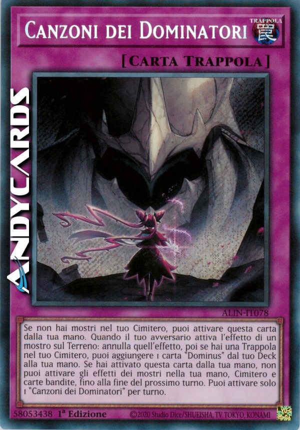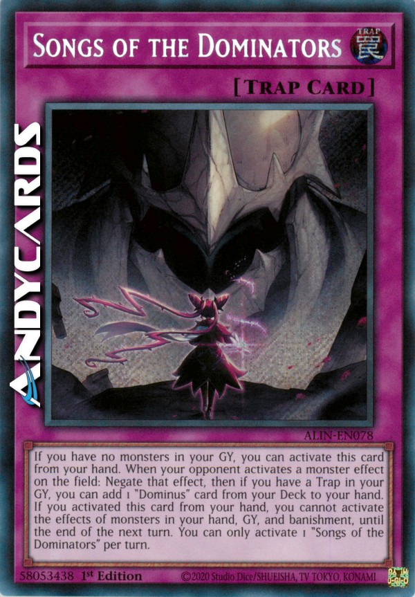 Se non hai mostri nel tuo Cimitero, puoi attivare questa carta dalla tua mano. Quando il tuo avversario attiva l'effetto di un mostro sul Terreno: annulla quell'effetto, poi se hai una Trappola nel tuo Cimitero, puoi aggiungere 1 carta "Dominus" dal tuo Deck alla tua mano. Se hai attivato questa carta dalla tua mano, non puoi attivare gli effetti dei mostri nella tua mano, Cimitero e carte bandite, fino alla fine del prossimo turno. Puoi attivare solo 1 "Canzoni dei Dominatori" per turno.