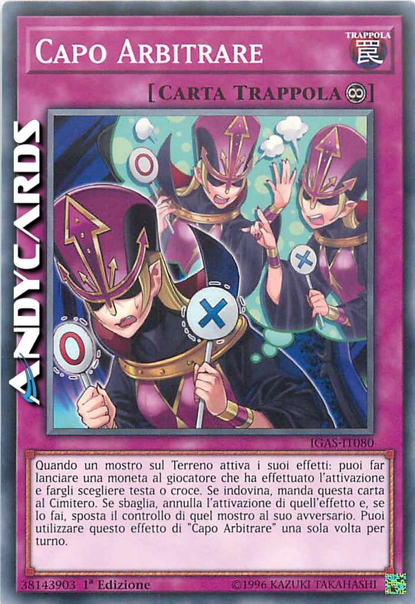 Quando un mostro sul Terreno attiva i suoi effetti: puoi far lanciare una moneta al giocatore che ha effettuato l'attivazione e fargli scegliere testa o croce. Se indovina, manda questa carta al Cimitero. Se sbaglia, annulla l'attivazione di quell'effetto e, se lo fai, sposta il controllo di quel mostro al suo avversario. Puoi utilizzare questo effetto di "Capo Arbitrare" una sola volta per turno.