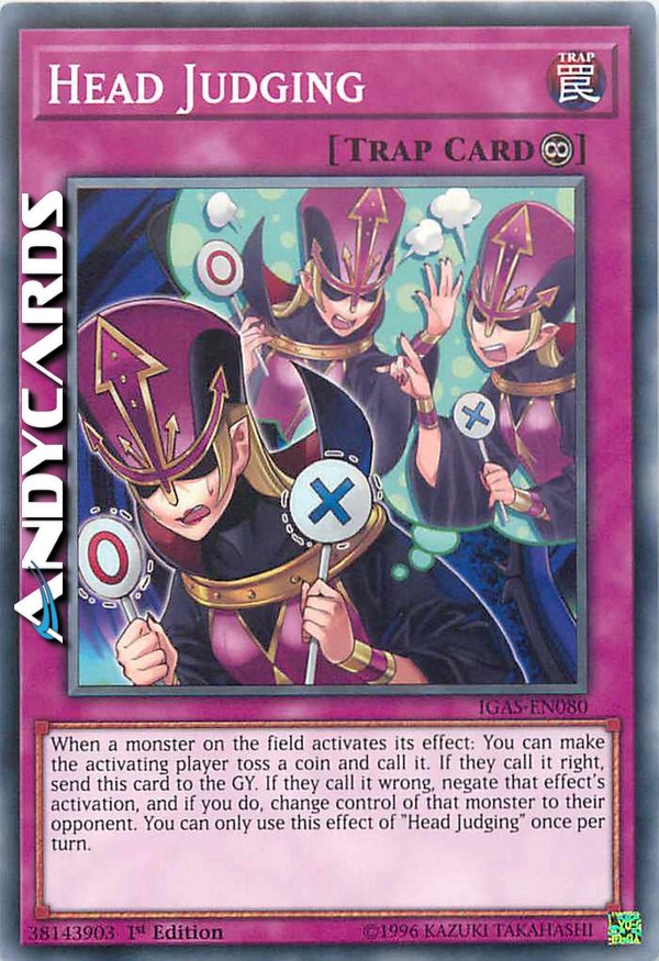 When a monster on the field activates its effect: You can make the activating player toss a coin and call it. If they call it right, send this card to the GY. If they call it wrong, negate that effect's activation, and if you do, change control of that monster to their opponent. You can only use this effect of "Head Judging" once per turn.