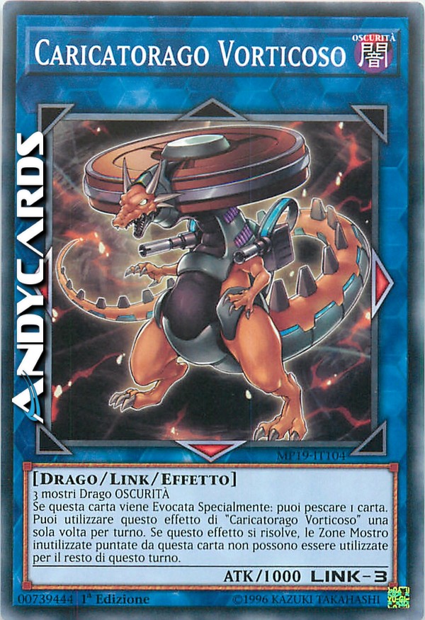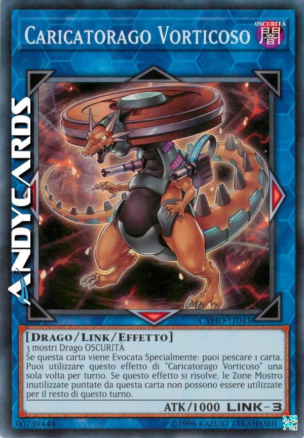 Se questa carta viene Evocata Specialmente: puoi pescare 1 carta. Puoi utilizzare questo effetto di "Caricatorago Vorticoso" una sola volta per turno. Se questo effetto si risolve, le Zone Mostro inutilizzate puntate da questa carta non possono essere utilizzate per il resto di questo turno.