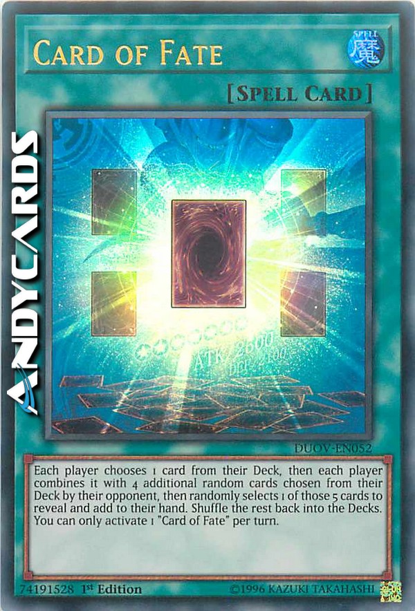 Ogni giocatore seleziona 1 carta dal suo Deck, poi ogni giocatore la combina con 4 carte a caso addizionali selezionate dal suo Deck dal suo avversario, poi seleziona a caso 1 di quelle 5 carte da rivelare e aggiungere alla sua mano. Mischia il resto nei Deck. Puoi attivare solo 1 "Carta del Fato" per turno.