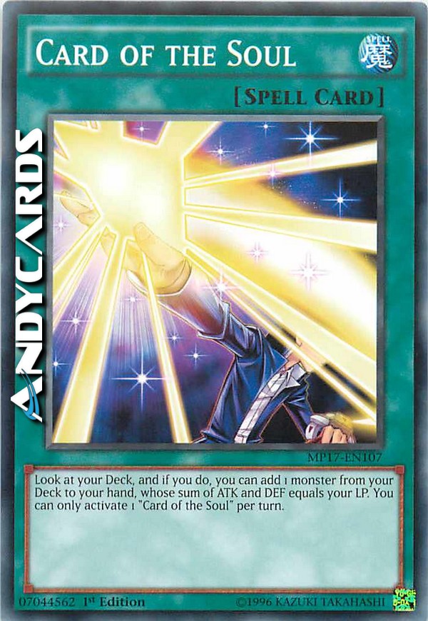 Look at your Deck, and if you do, you can add 1 monster from your Deck to your hand, whose sum of ATK and DEF equals your LP. You can only activate 1 "Card of the Soul" per turn.
