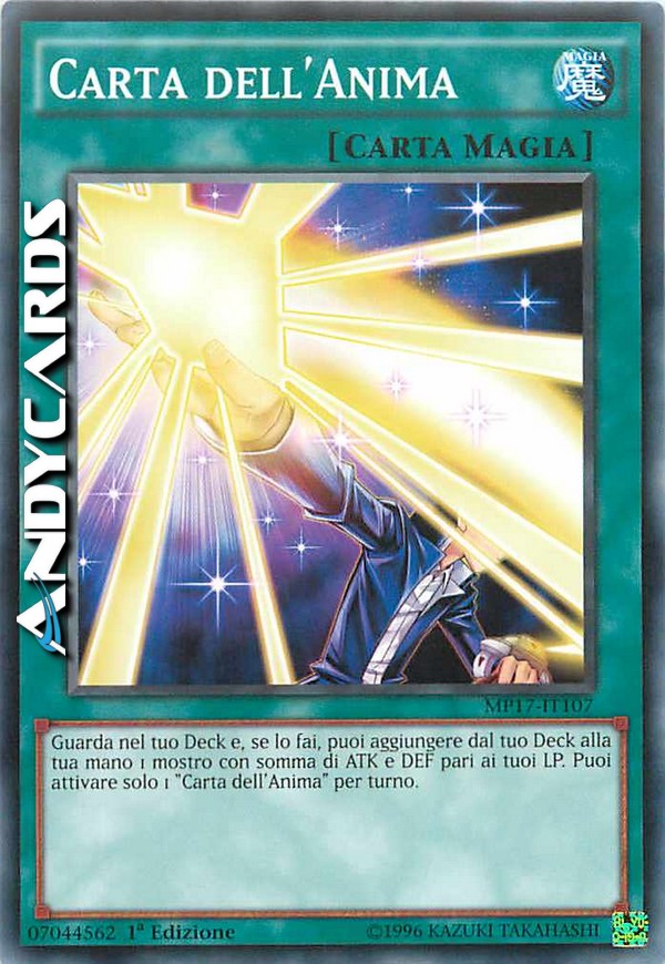 Guarda nel tuo Deck e, se lo fai, puoi aggiungere dal tuo Deck alla tua mano 1 mostro con somma di ATK e DEF pari ai tuoi LP. Puoi attivare solo 1 "Carta dell'Anima" per turno.