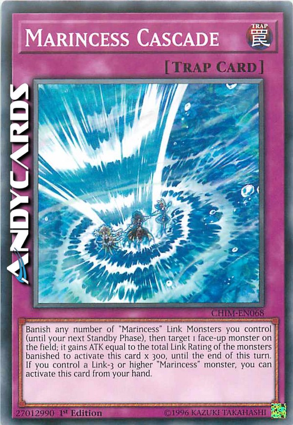 Bandisci un qualsiasi numero di Mostri Link "Marincipessa" che controlli (fino alla tua prossima Standby Phase), poi scegli come bersaglio 1 mostro scoperto sul Terreno; esso guadagna ATK pari alla somma delle Classificazioni Link dei mostri banditi per attivare questa carta x 300, fino alla fine di questo turno. Se controlli un mostro "Marincipessa" Link-3 o superiore, puoi attivare questa carta dalla tua mano.