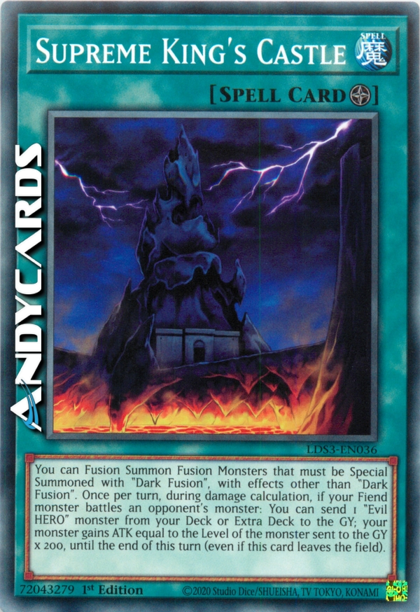 Puoi Evocare tramite Fusione i Mostri Fusione che devono essere Evocati Specialmente con "Fusione Oscura" con effetti diversi da "Fusione Oscura". Una volta per turno, durante il calcolo dei danni, se un tuo mostro Demone combatte con un mostro dell'avversario: puoi mandare 1 mostro "EROE Malvagio" dal tuo Deck o Extra Deck al Cimitero; il tuo mostro guadagna ATK pari al Livello del mostro mandato al Cimitero x 200, fino alla fine di questo turno (anche se questa carta lascia il Terreno).