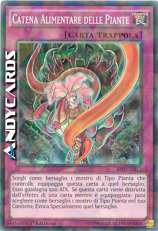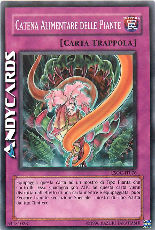 Equipaggia questa carta ad un mostro di Tipo Pianta che controlli. Esso guadagna 500 ATK. Se questa carta viene distrutta dall'effetto di una carta mentre è equipaggiata, puoi Evocare tramite Evocazione Speciale 1 mostro di Tipo Pianta dal tuo Cimitero.