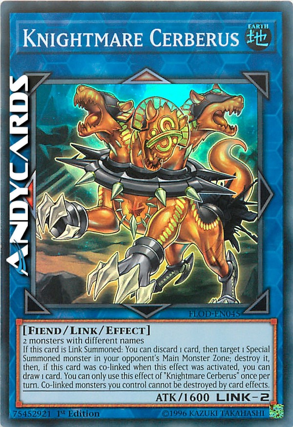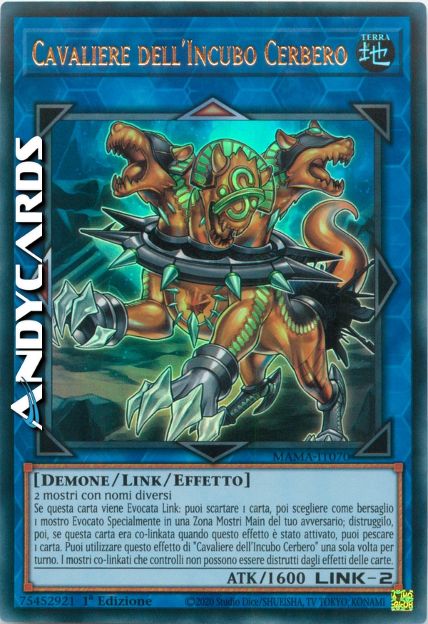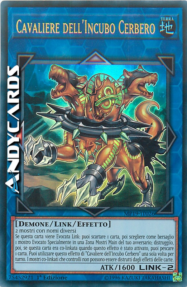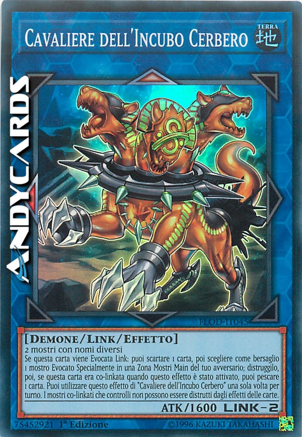 Se questa carta viene Evocata Link: puoi scartare 1 carta, poi scegliere come bersaglio 1 mostro Evocato Specialmente in una Zona Mostri Main del tuo avversario; distruggilo, poi, se questa carta era co-linkata quando questo effetto è stato attivato, puoi pescare 1 carta. Puoi utilizzare questo effetto di "Cavaliere dell'Incubo Cerbero" una sola volta per turno. I mostri co-linkati che controlli non possono essere distrutti dagli effetti delle carte.