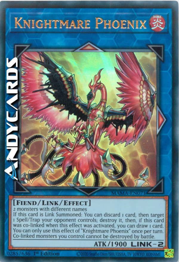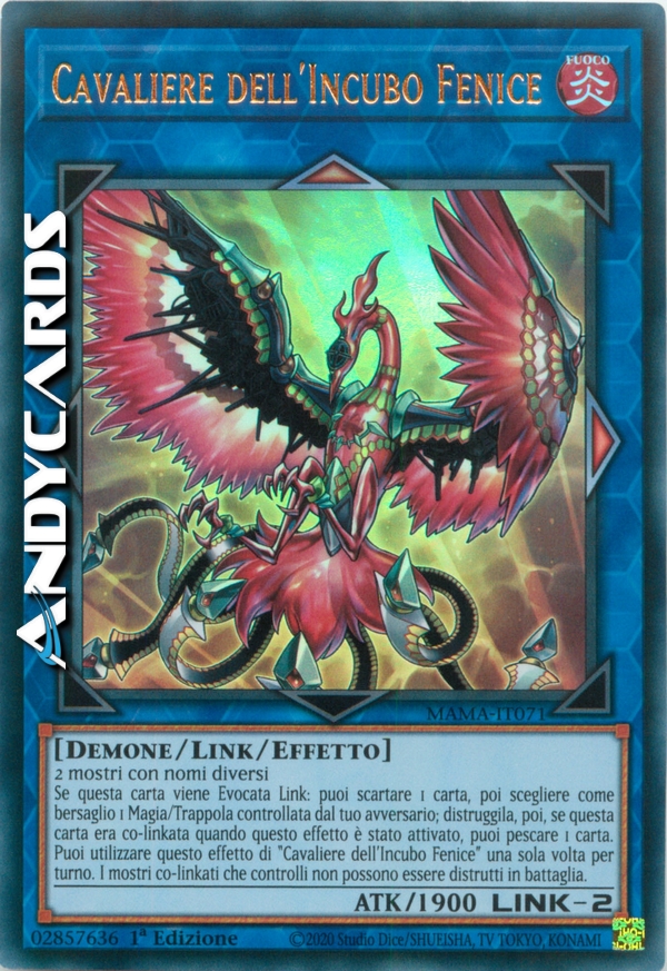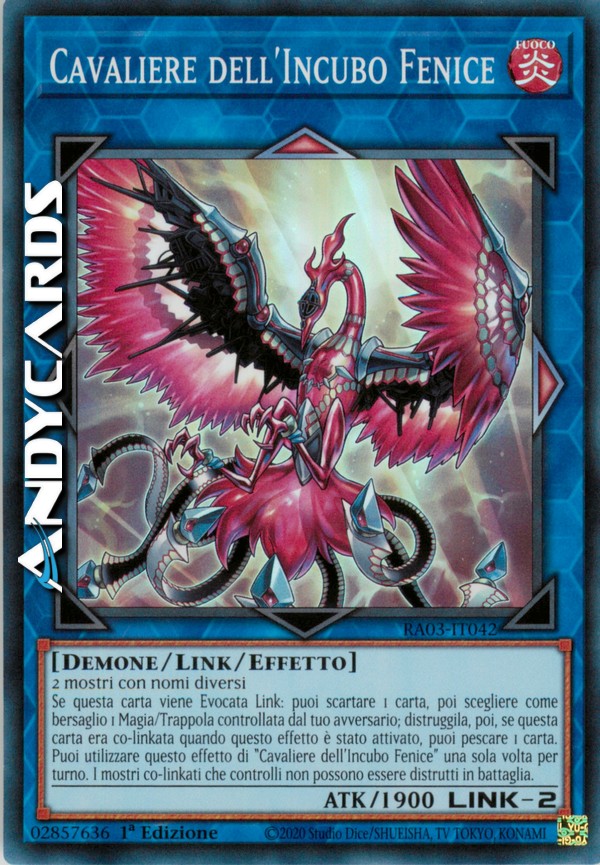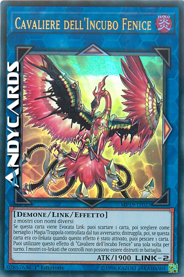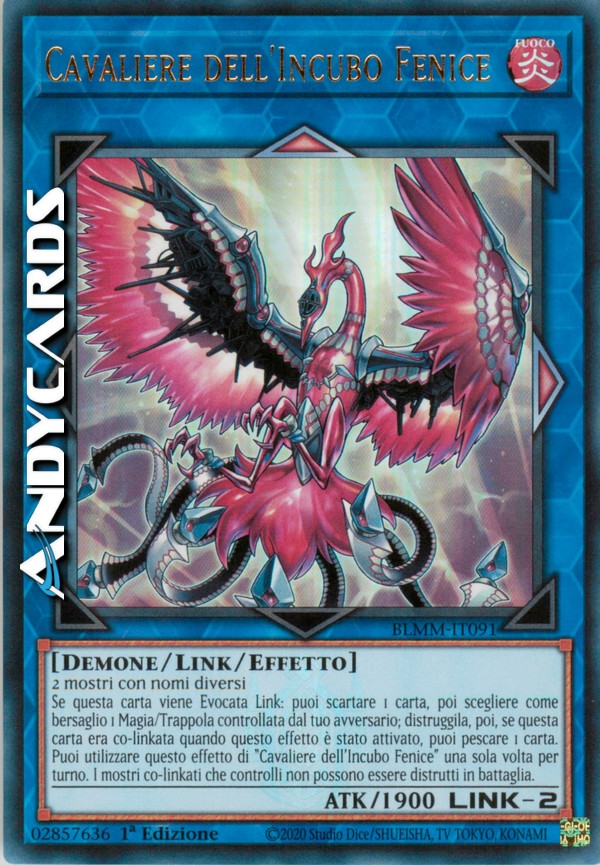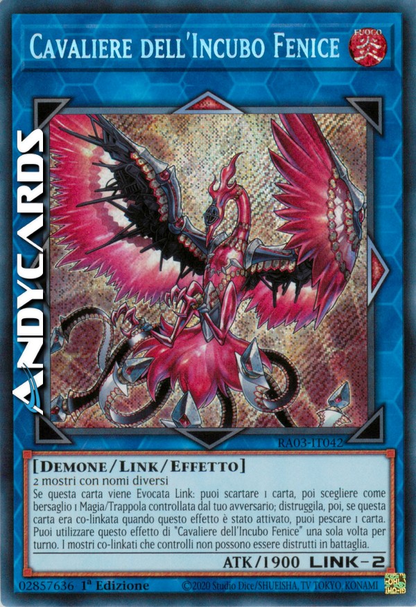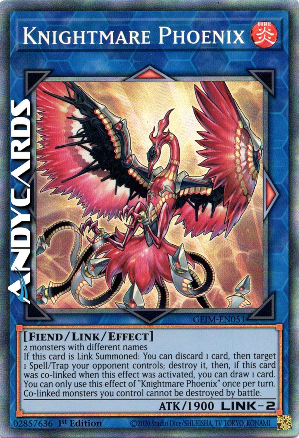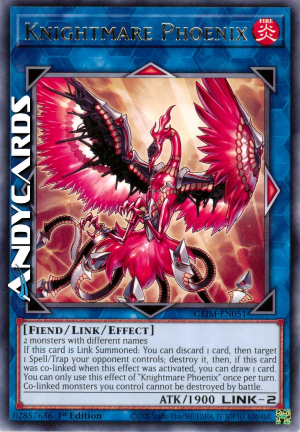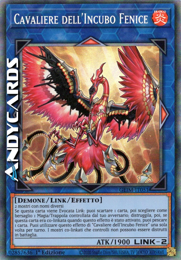 Se questa carta viene Evocata Link: puoi scartare 1 carta, poi scegliere come bersaglio 1 Magia/Trappola controllata dal tuo avversario; distruggila, poi, se questa carta era co-linkata quando questo effetto è stato attivato, puoi pescare 1 carta. Puoi utilizzare questo effetto di "Cavaliere dell'Incubo Fenice" una sola volta per turno. I mostri co-linkati che controlli non possono essere distrutti in battaglia.