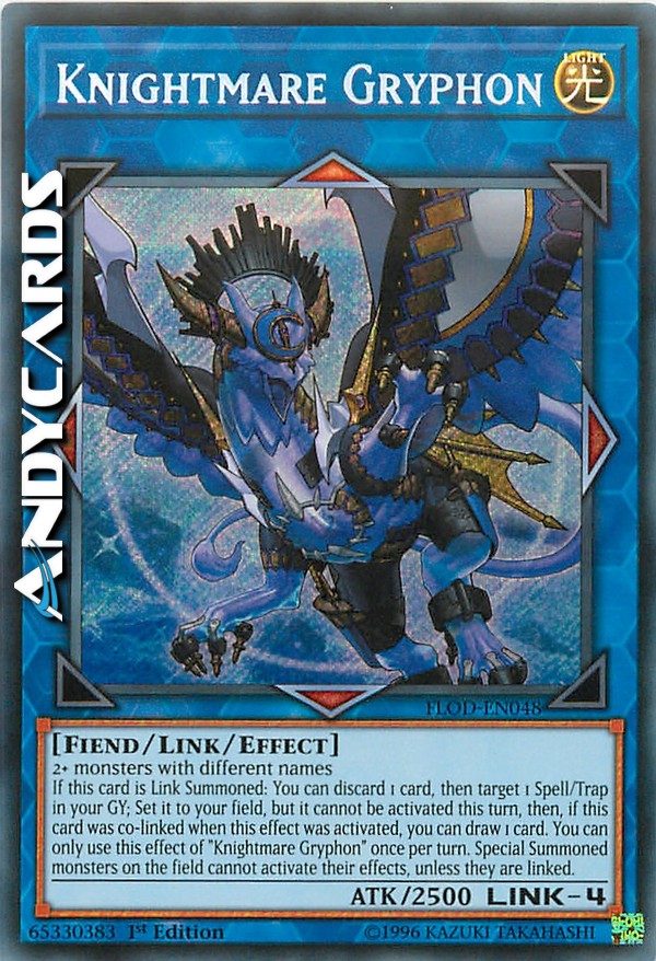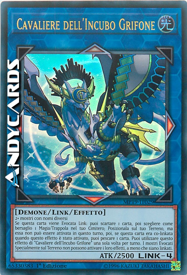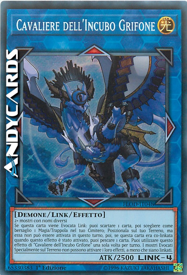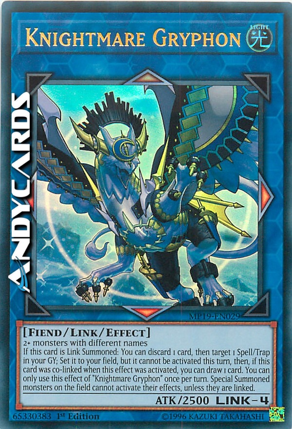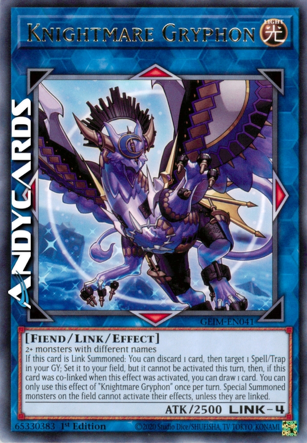 Se questa carta viene Evocata Link: puoi scartare 1 carta, poi scegliere come bersaglio 1 Magia/Trappola nel tuo Cimitero; Posizionala sul tuo Terreno, ma essa non può essere attivata in questo turno, poi, se questa carta era co-linkata quando questo effetto è stato attivato, puoi pescare 1 carta. Puoi utilizzare questo effetto di "Cavaliere dell'Incubo Grifone" una sola volta per turno. I mostri Evocati Specialmente sul Terreno non possono attivare i loro effetti, a meno che siano linkati.