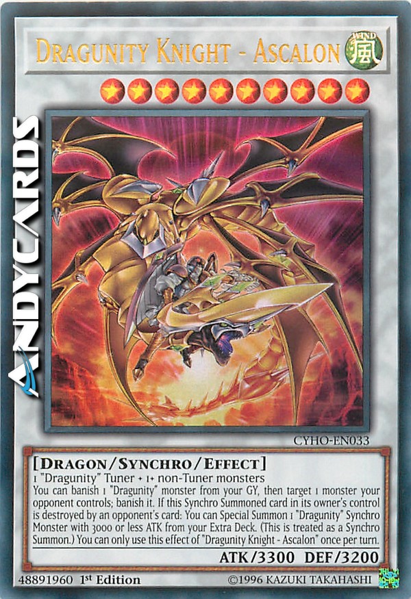 You can banish 1 "Dragunity" monster from your GY, then target 1 monster your opponent controls; banish it. If this Synchro Summoned card in its owner's control is destroyed by an opponent's card: You can Special Summon 1 "Dragunity" Synchro Monster with 3000 or less ATK from your Extra Deck. (This is treated as a Synchro Summon.) You can only use this effect of "Dragunity Knight - Ascalon" once per turn.