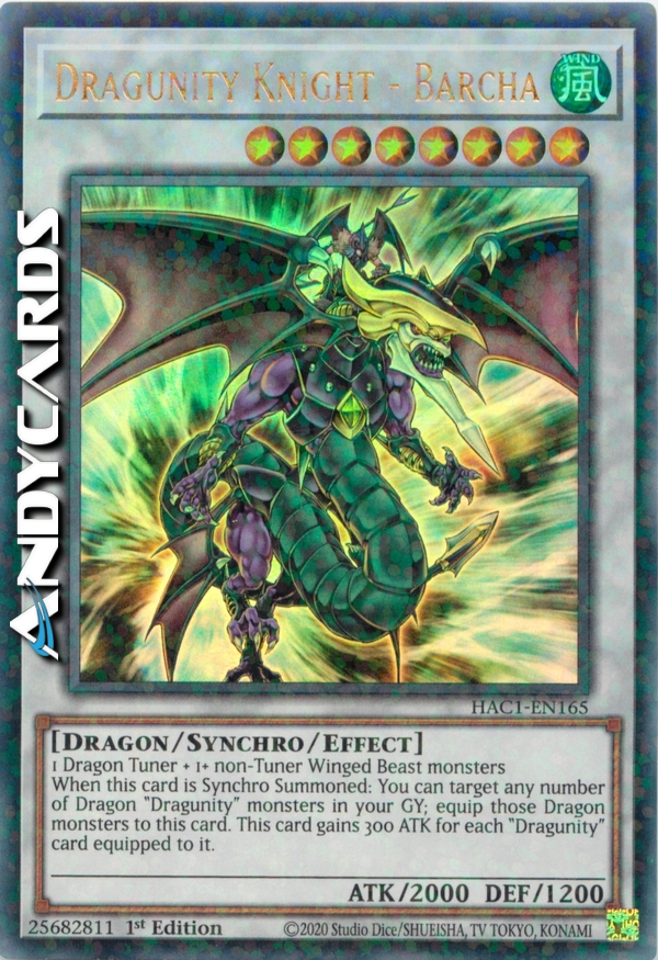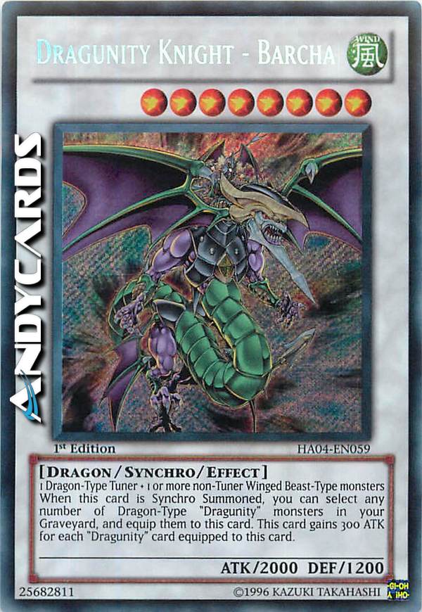 When this card is Synchro Summoned, you can select any number of Dragon-Type "Dragunity" monsters in your Graveyard, and equip them to this card. This card gains 300 ATK for each "Dragunity" card equipped to this card.