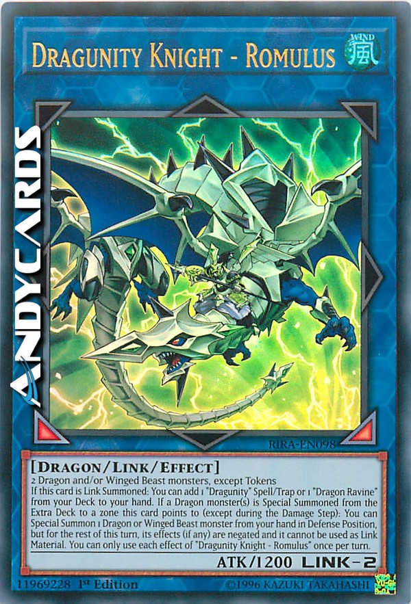 If this card is Link Summoned: You can add 1 "Dragunity" Spell/Trap or 1 "Dragon Ravine" from your Deck to your hand. If a Dragon monster(s) is Special Summoned from the Extra Deck to a zone this card points to (except during the Damage Step): You can Special Summon 1 Dragon or Winged Beast monster from your hand in Defense Position, but for the rest of this turn, its effects (if any) are negated and it cannot be used as Link Material. You can only use each effect of "Dragunity Knight - Romulus" once per turn.