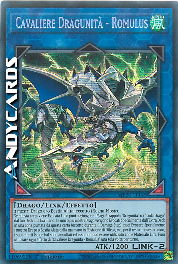 Se questa carta viene Evocata Link: puoi aggiungere 1 Magia/Trappola "Dragunità" o 1 "Gola Drago" dal tuo Deck alla tua mano. Se uno o più mostri Drago vengono Evocati Specialmente dall'Extra Deck in una zona puntata da questa carta (eccetto durante il Damage Step): puoi Evocare Specialmente 1 mostro Drago o Bestia Alata dalla tua mano in Posizione di Difesa, ma, per il resto di questo turno, i suoi effetti (se ne ha) sono annullati ed esso non può essere utilizzato come Materiale Link. Puoi utilizzare ogni effetto di "Cavaliere Dragunità - Romulus" una sola volta per turno.