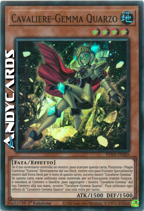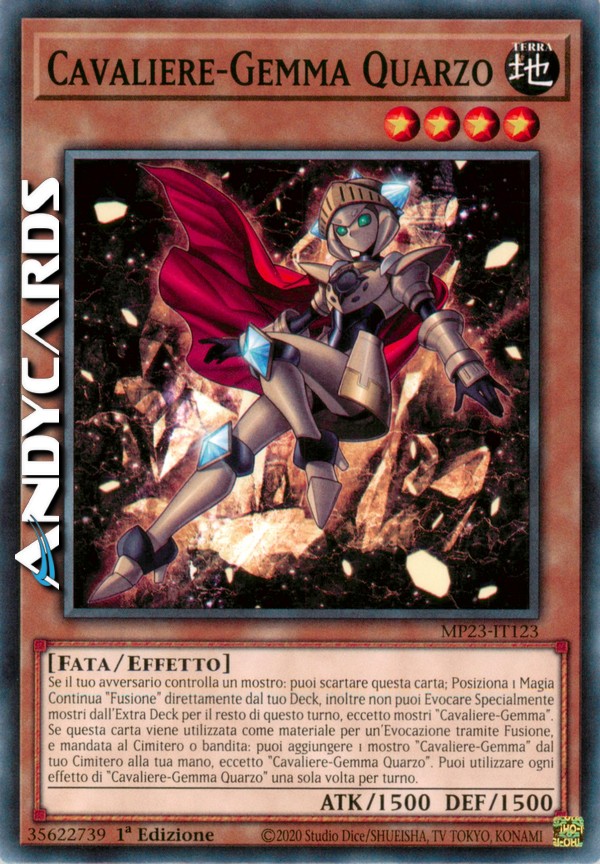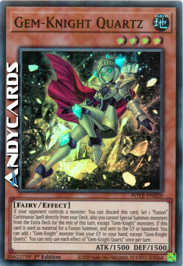 Se il tuo avversario controlla un mostro: puoi scartare questa carta; Posiziona 1 Magia Continua "Fusione" direttamente dal tuo Deck, inoltre non puoi Evocare Specialmente mostri dall'Extra Deck per il resto di questo turno, eccetto mostri "Cavaliere-Gemma". Se questa carta viene utilizzata come materiale per un'Evocazione tramite Fusione, e mandata al Cimitero o bandita: puoi aggiungere 1 mostro "Cavaliere-Gemma" dal tuo Cimitero alla tua mano, eccetto "Cavaliere-Gemma Quarzo". Puoi utilizzare ogni effetto di "Cavaliere-Gemma Quarzo" una sola volta per turno.